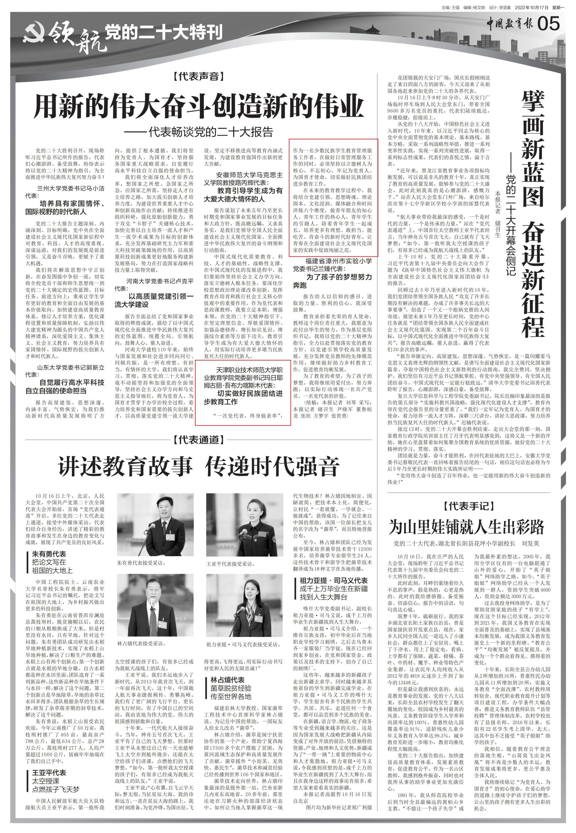 本网讯【通讯员 党萱】10月17日出版的《中国教育报》“领航”党的二十大特刊,以“用新的伟大奋斗创造新的伟业——代表畅谈党的二十大报告”为题采访报道党的二十大代表、职业教育学院党委副书记玛日耶姆古丽•吾布力喀斯木学习党的二十大报告的感想和体会。