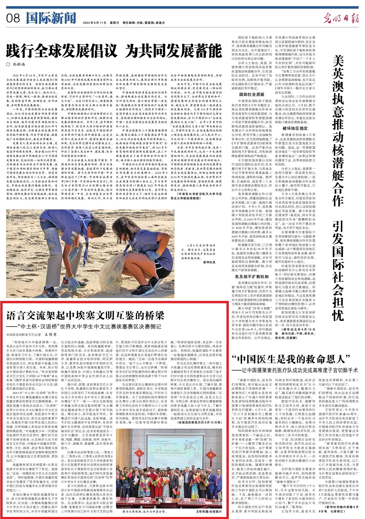 本网讯【通讯员 党萱】6月11日,《光明日报》以“语言交流架起中埃塞文明互鉴的桥梁——‘中土杯·汉语桥’世界大中学生中文比赛埃塞赛区决赛侧记”为题报道由中国驻埃塞使馆主办、亚大孔院和由永利官网援建的埃塞俄比亚亚的斯亚贝巴大学孔子学院共同承办的2023年“中土杯·汉语桥”世界大中学生中文比赛埃塞赛区决赛圆满落幕。亚大孔院院长、402am永利手机版外国语学院教授高莉莉接受采访。