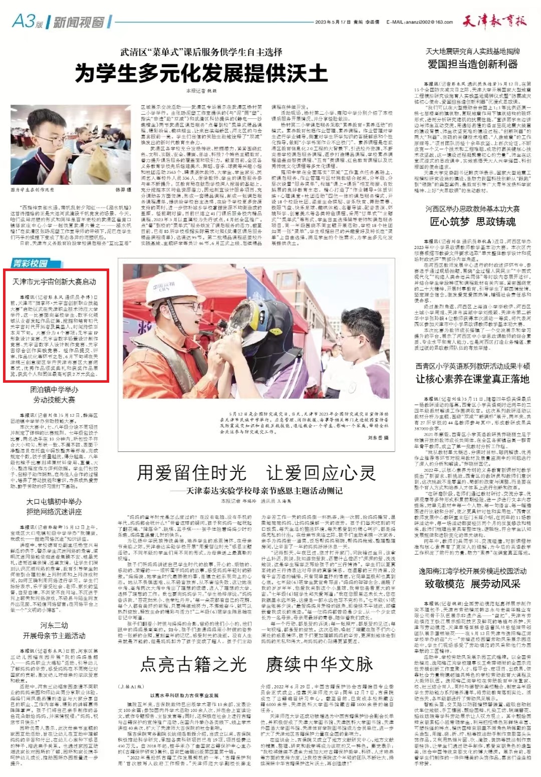 本网讯【通讯员 陈明】5月17日,《天津教育报》以“天津市元宇宙创新大赛启动”为题报道天津市“猫享杯·元宇宙创新职业技能大赛”启动仪式在永利官网举行。